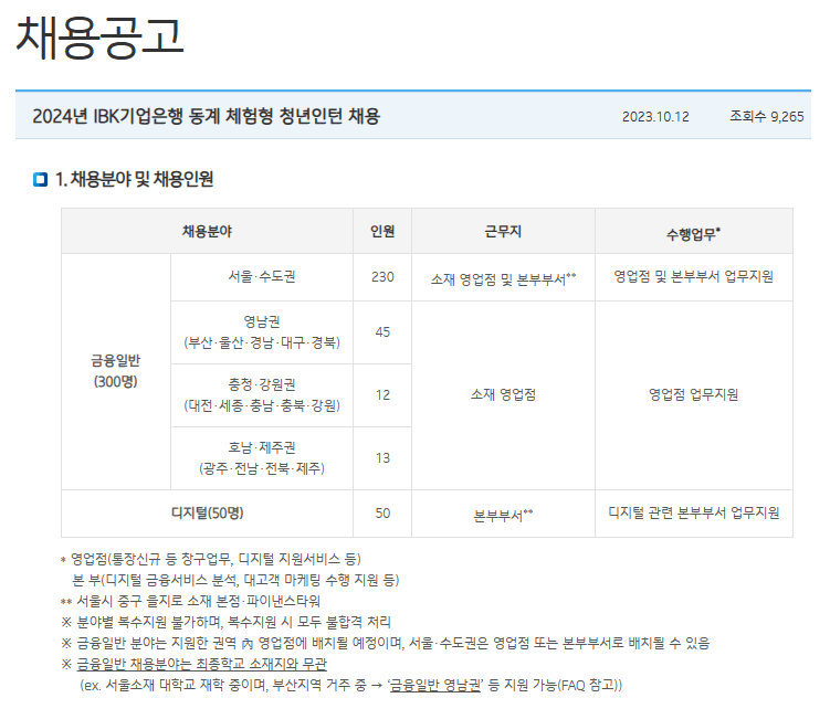 채용분야 및 담당업무: 영업점(통장신규 등 창구업무, 디지털 지원서비스 등), 본부(디지털 금융서비스 분석, 대고객 마케팅 수행 지원 등).