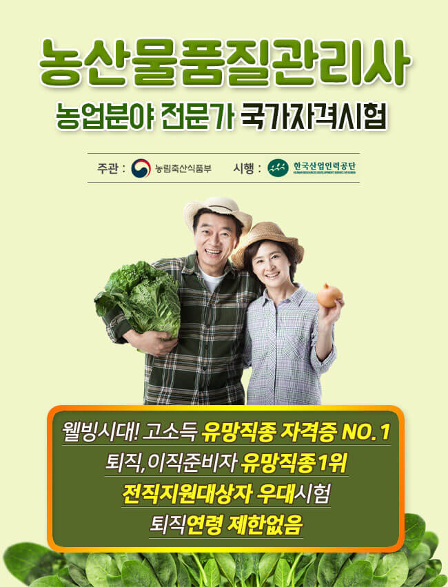 농산물품질관리사는 나이, 학력, 연령에 제한없이 응시가 가능한 국가공인자격증 입니다.