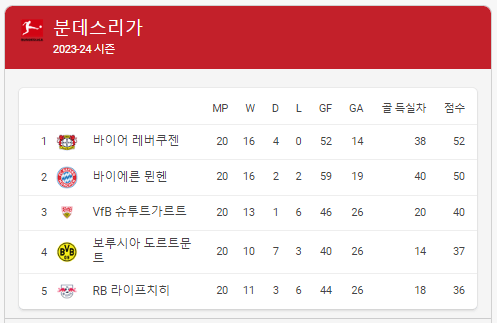 2023-2024 분데스리가 시즌의 구단 순위는 다음과 같습니다: