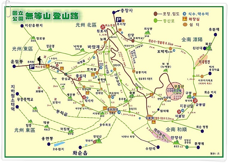 원효사 - 옛길 코스: 이 코스는 원효사입구에서 출발하여 늦재, 동화사터, 장불재를 거쳐 옛길을 따라 다시 원효사로 돌아오는 코스입니다. 대중교통을 이용하기에 가장 적당한 코스입니다.