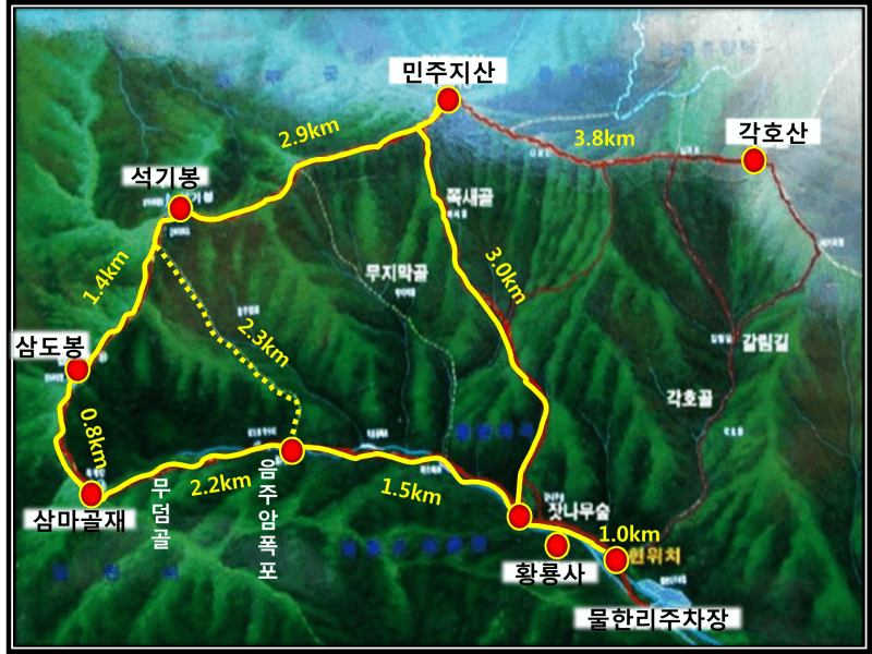 민주지산의 최단 등산코스는 민주지산 자연휴양림 - 민주지산 정상 - 민주지산 자연휴양림 (원점 회귀)로, 산행거리는 왕복 6.6km입니다. 총 소요시간은 편도 90분 출발지점에서 출발 기준으로 이정표 기준 왕복 150분 (2시간 30분), 고수 기준 왕복 105분 (1시간 45분), 초보 기준 왕복 155분 (2시간 35분)입니다. 등산요금은 성인 1,000원, 청소년 800원, 어린이 300원이며, 주차비는 대형 5,000원, 소형 3,000원입니다.