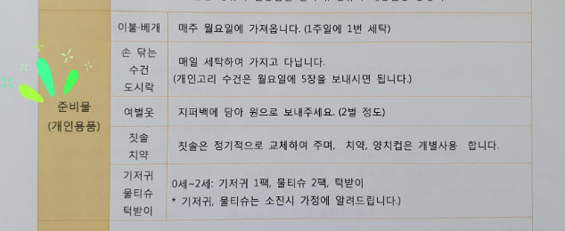 - 여분의 옷: 유치원에서는 아이가 놀다가 옷이 더러워질 수 있습니다. 여분의 옷을 준비해 두면 좋습니다.