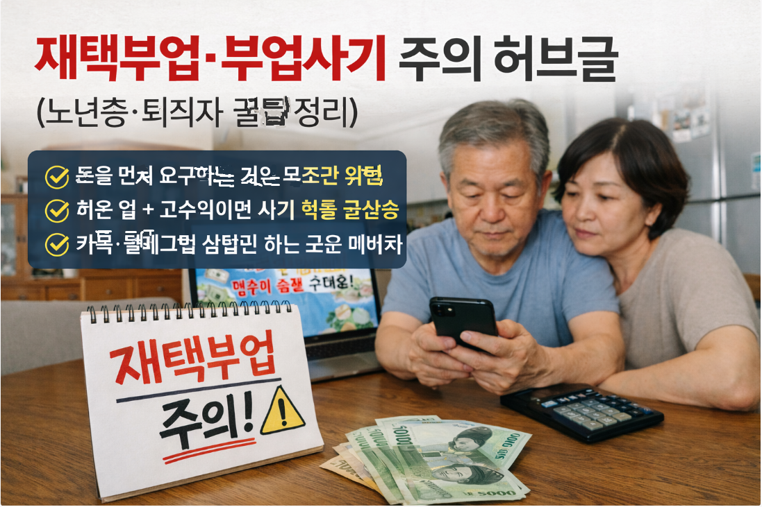특히 디지털에 익숙하지 않은 노년층부업, 퇴직자부업을 찾는 분들이 피해자가 되는 사례가 계속 늘고 있어, 이 글에서는 재택부업 관련 핵심 글들을 한 번에 모아 정리했습니다.