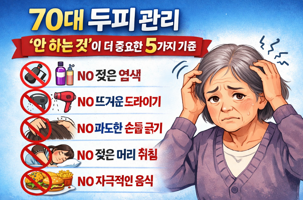 70대에 접어들면 두피의 유분기가 줄어들고 피부막이 얇아져 쉽게 예민해집니다. 이때는 무언가를 더 하기보다, 두피에 자극을 주는 행동을 ‘안 하는 것’만으로도 모근을 보호하고 탈모를 예방하는 데 도움이 됩니다.