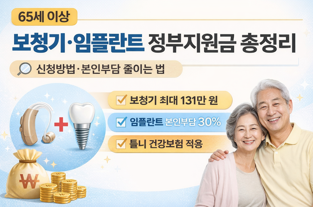 보청기와 임플란트는 어르신들의 삶의 질을 좌우하는 대표적인 의료 항목이지만, 비용 부담이 매우 큰 편입니다. 다행히 조건만 맞으면 정부지원금 또는 건강보험 적용으로 비용을 크게 줄일 수 있습니다. 이 글에서는 65세 이상 보청기 지원금과 65세 이상 임플란트 건강보험 혜택을 한눈에 보기 쉽게 정리해드립니다.